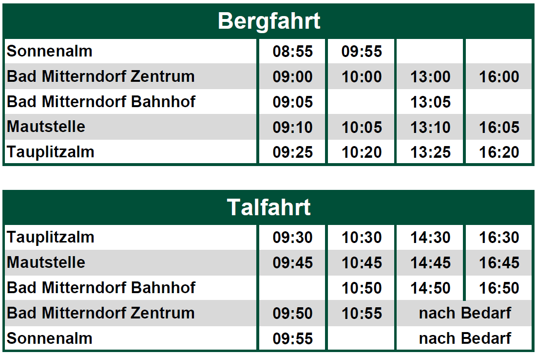 Zwischen Bad Mitterndorf und der Tauplitzalm wird in der Sommer- und Wintersaison ein Linienverkehr geführt.